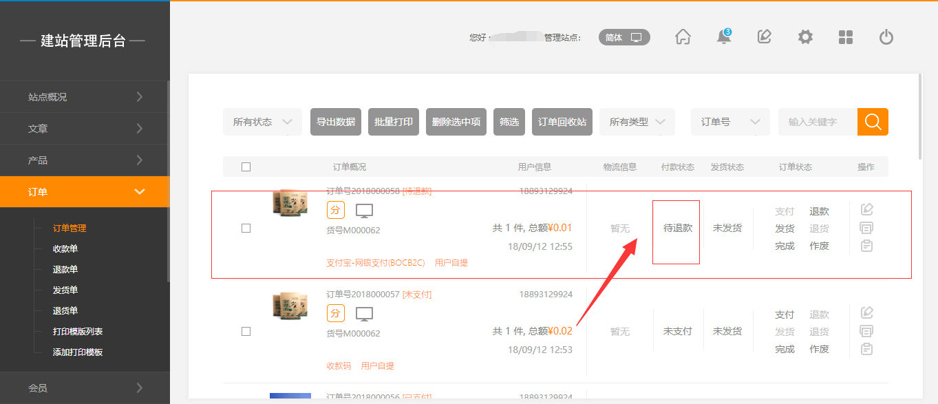1. 在建站后台,“订单”-“订单管理”页面,当订单支付方式为微信且用户申请退款,现在只要配置正确证书,点击“保存”即可原路退款,如图所示: